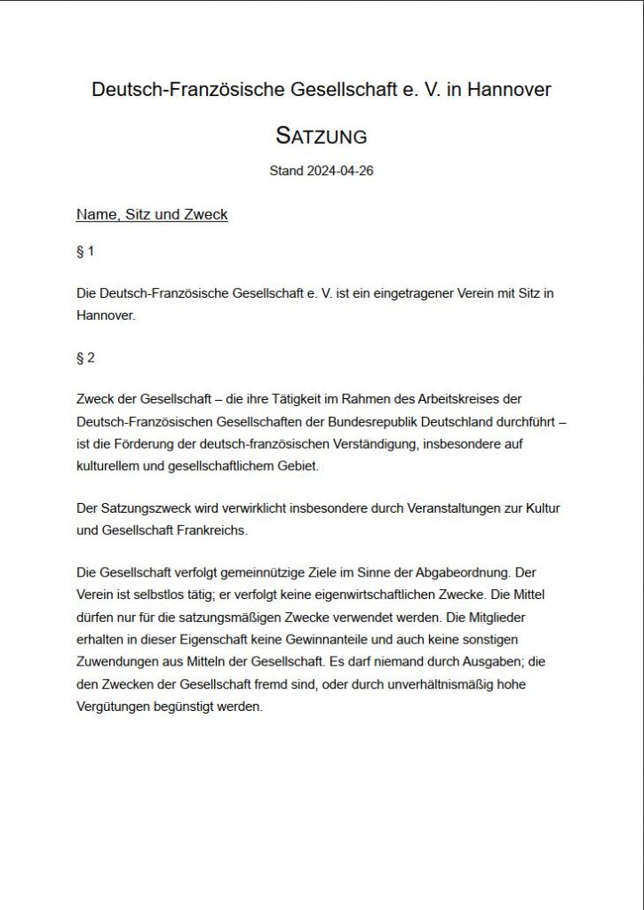 Die rechtskräftige Satzung ist die deutschsprachige Fassung. Die französischsprachige Fassung dient nur zur Information. Klicken Sie auf dem Bild um die Datei herunterzuladen.